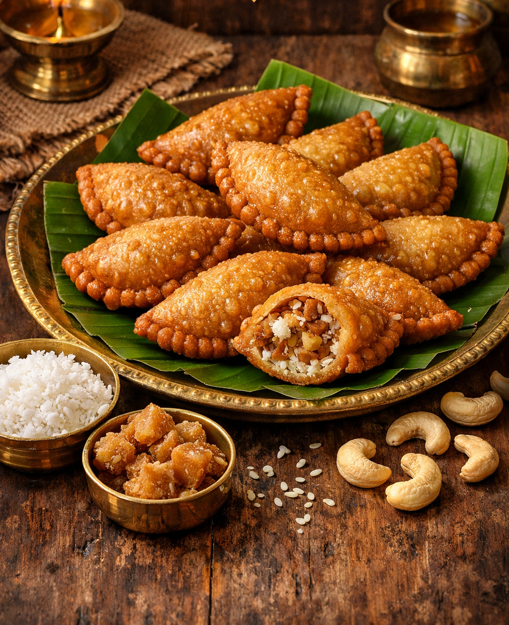 Garijalu (or Kajjikayalu) with bellam is a traditional South Indian deep-fried dumpling, filled with a mixture of grated coconut, roasted semolina, and jaggery. The crispy, flaky outer shell is usually made from refined flour or wheat flour and fried until golden brown. Often made during festivals like Sankranti and Diwali, these treats feature a sweet, aromatic, and nutty filling enriched with cardamom powder